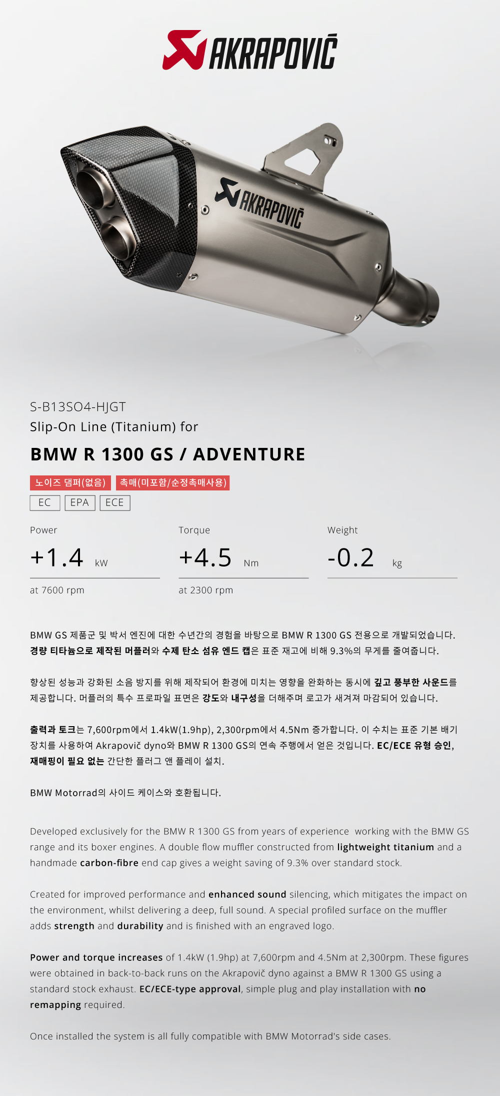 »óǰ¸í : ¾ÆÅ©¶óÆ÷ºò(Akrapovic) BMW R1300GS/ADVENTURE '24~'26 ¸ÓÇ÷¯ SLIP-ON TITAN S-B13SO4-HJGT |