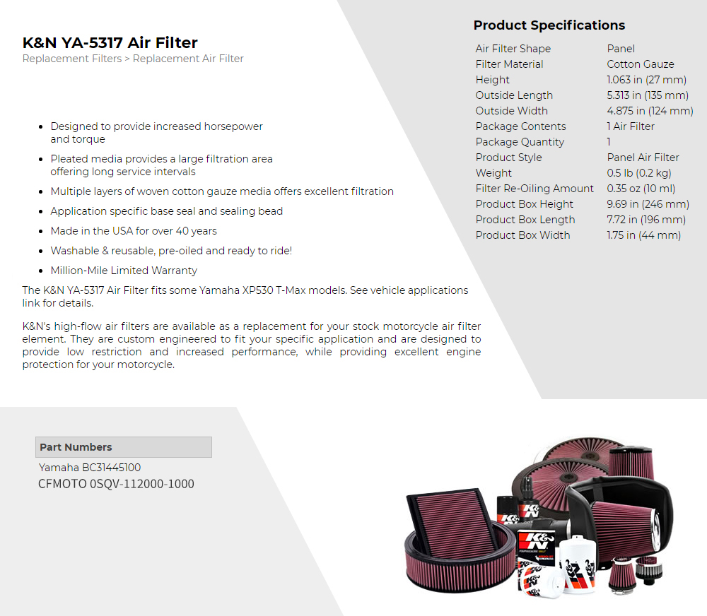 ÀÌÀü»óǰ K&N YAMAHA(¾ß¸¶ÇÏ) XP530 T-MAX DX '17~'19, CFMOTO(¾¾¿¡ÇÁ¸ðÅä) 450SR/NK/MT/CLC '23~'25 ¿¡¾îÅ©¸®³Ê YA-5317 ´ÙÀ½»óǰ
