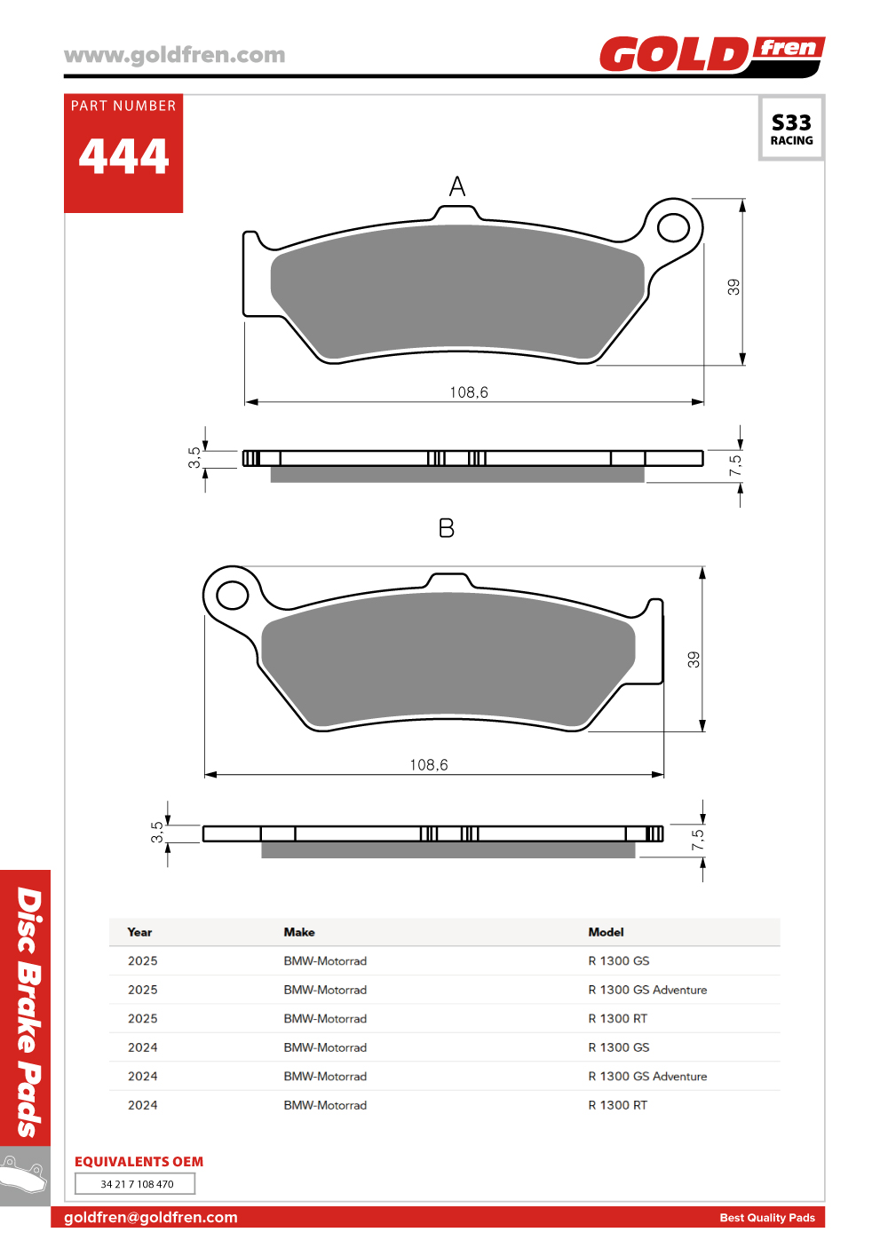 Goldfren(°ñµåÇÁ·») Brake Pads (ºê·¹ÀÌÅ© ÆÐµå) G444-S33 |