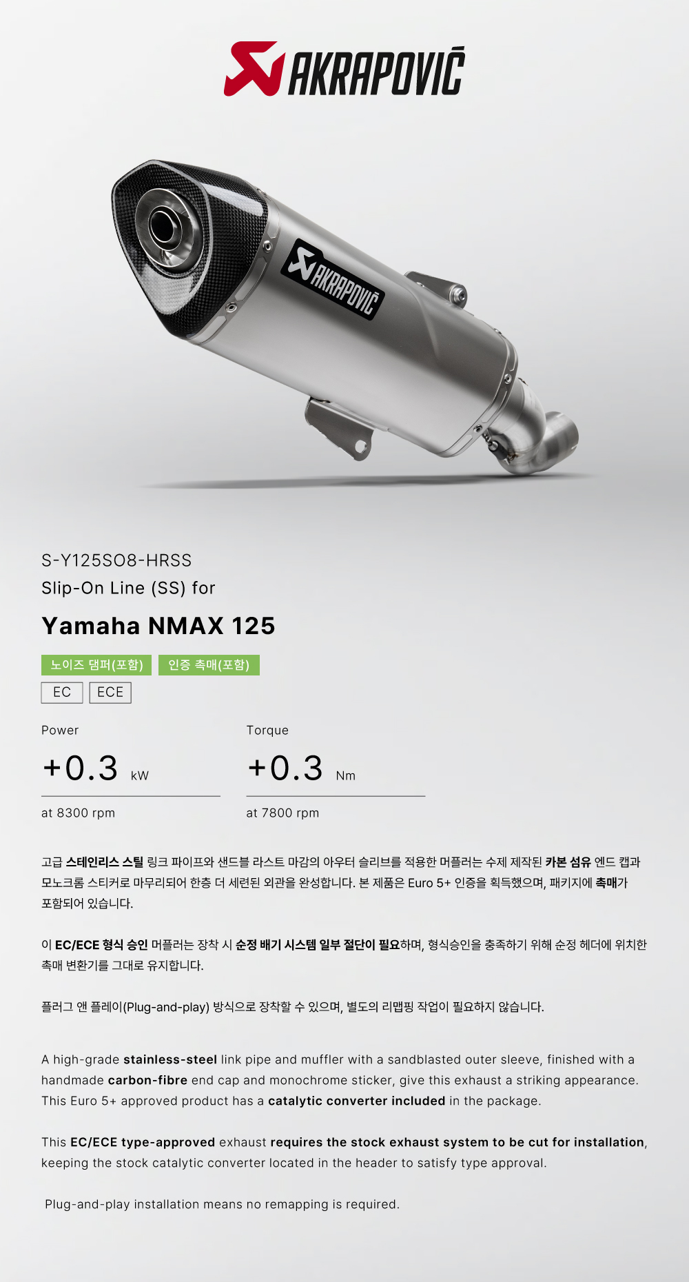 »óǰ¸í : ¾ÆÅ©¶óÆ÷ºò(Akrapovic) YAMAHA NMAX125 EURO5+ '25~ ¸ÓÇ÷¯ SLIP-ON STAINLESS S-Y125SO8-HRSS |