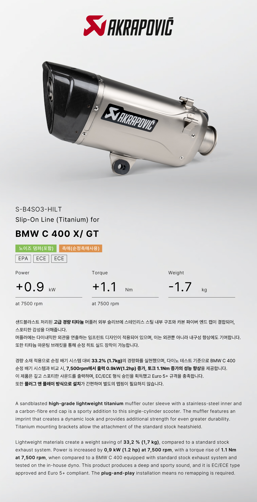 »óǰ¸í : ¾ÆÅ©¶óÆ÷ºò(Akrapovic) BMW C400X/GT '25~'26 EURO5+ ¸ÓÇ÷¯ SLIP-ON TITANIUM S-B4SO3-HILT |