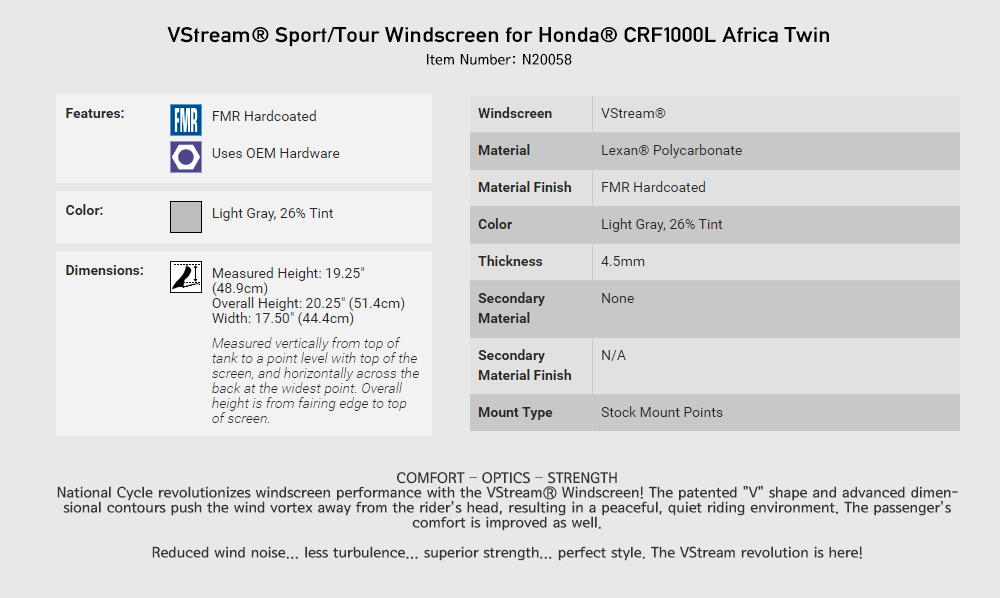 ³×¼Å³Î½ÎÀÌŬ(Nationalcycle) HONDA(È¥´Ù) CRF1000L Africa Twin/Adventure Sports '16~'19 VStream¢ç Sport/Tour Windscreen - Light Tint(ºêÀ̽ºÆ®¸² ½ºÆ÷Ã÷ Åõ¾î À©µå½ºÅ©¸°) N20058 |