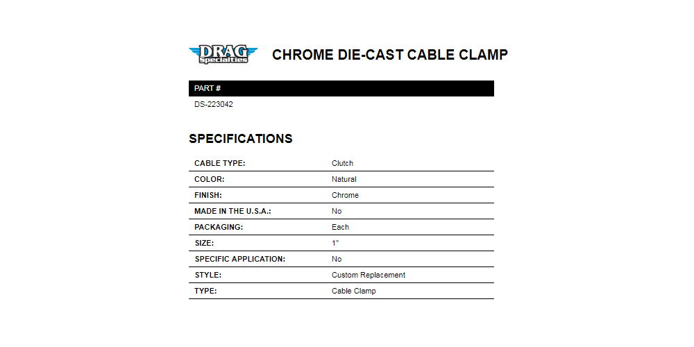 µå·¡±×½ºÆä¼È(DragSpecialties) Chrome Die-Cast Cable Clamp (Å©·Ò ÄÉÀ̺í Ŭ·¥ÇÁ 1ÀÎÄ¡) DS-223042 |